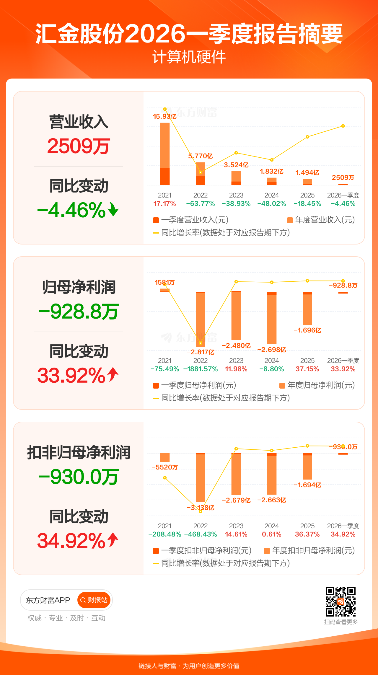 汇金股份4月25日发布2026年一季报显示,公司一季度实现营业收入2508.89万元,同比下滑4.46%;归母净利润-928.81万元;扣非归母净利润-929.96万元。