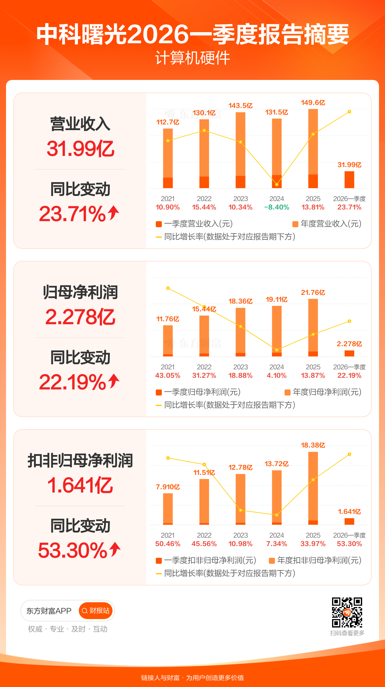 中科曙光4月25日发布2026年一季报显示,公司一季度实现营业收入31.99亿元,同比增长23.71%;归母净利润2.28亿元,同比增长22.19%;扣非归母净利润1.64亿元,同比增长53.30%。