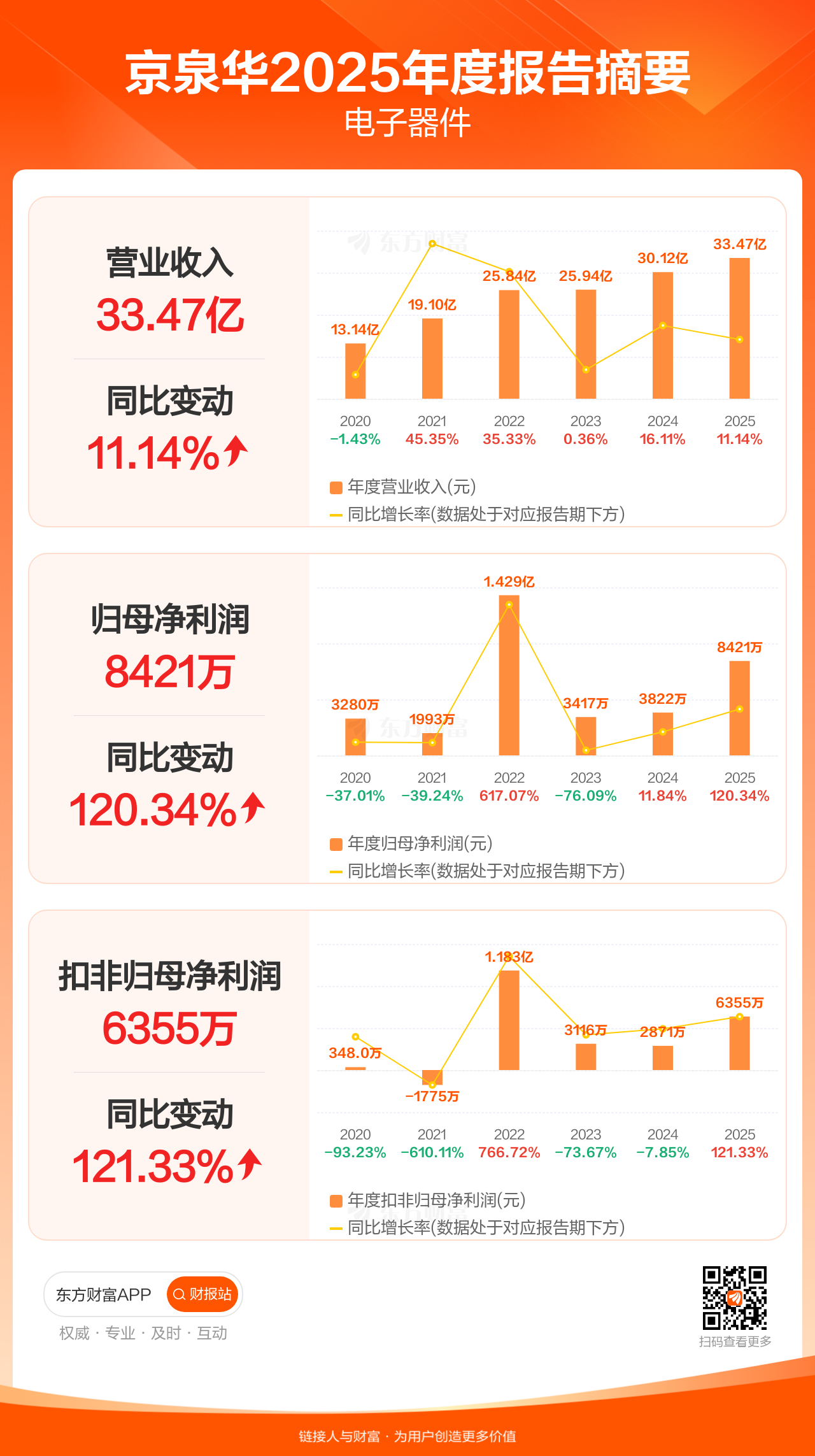 京泉华4月25日发布2025年年报显示,公司全年实现营业收入33.47亿元,同比增长11.14%;归母净利润8421.19万元,同比增长120.34%;扣非归母净利润6355.33万元,同比增长121.33%。