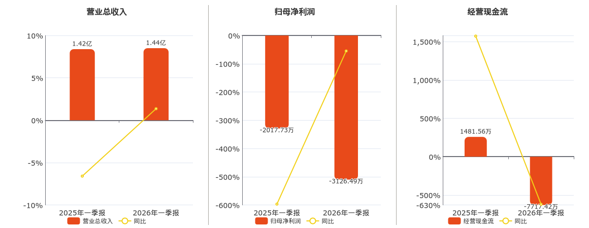 公司营业总收入为1.44亿元。归母净利润为-3126.49万元,较去年同报告期归母净利润减少1108.76万元。经营活动现金净流入为-7717.42万元,较去年同报告期经营活动现金净流入减少9198.98万元,同比较去年同期下降620.90%。