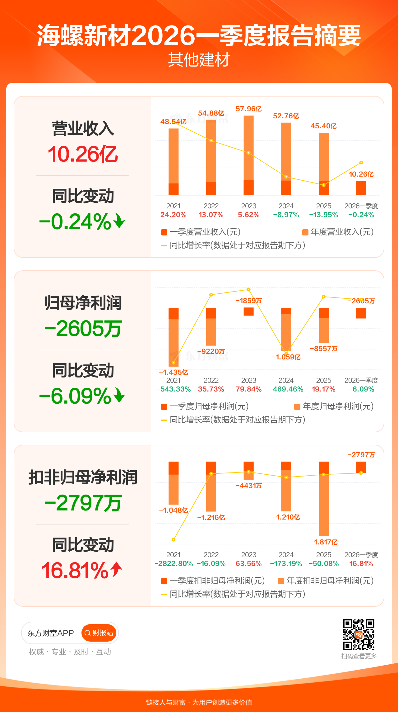 海螺新材4月25日发布2026年一季报显示,公司一季度实现营业收入10.26亿元,同比下滑0.24%;归母净利润-2604.95万元;扣非归母净利润-2796.60万元。