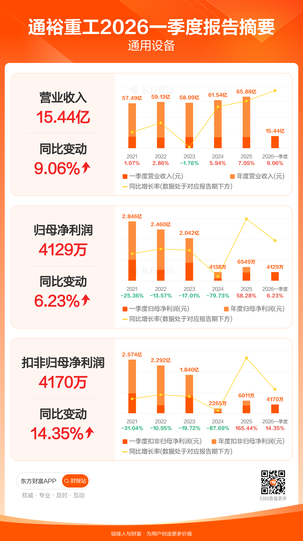 通裕重工4月25日发布2026年一季报显示,公司一季度实现营业收入15.44亿元,同比增长9.06%;归母净利润4129.17万元,同比增长6.23%;扣非归母净利润4170.00万元,同比增长14.35%。