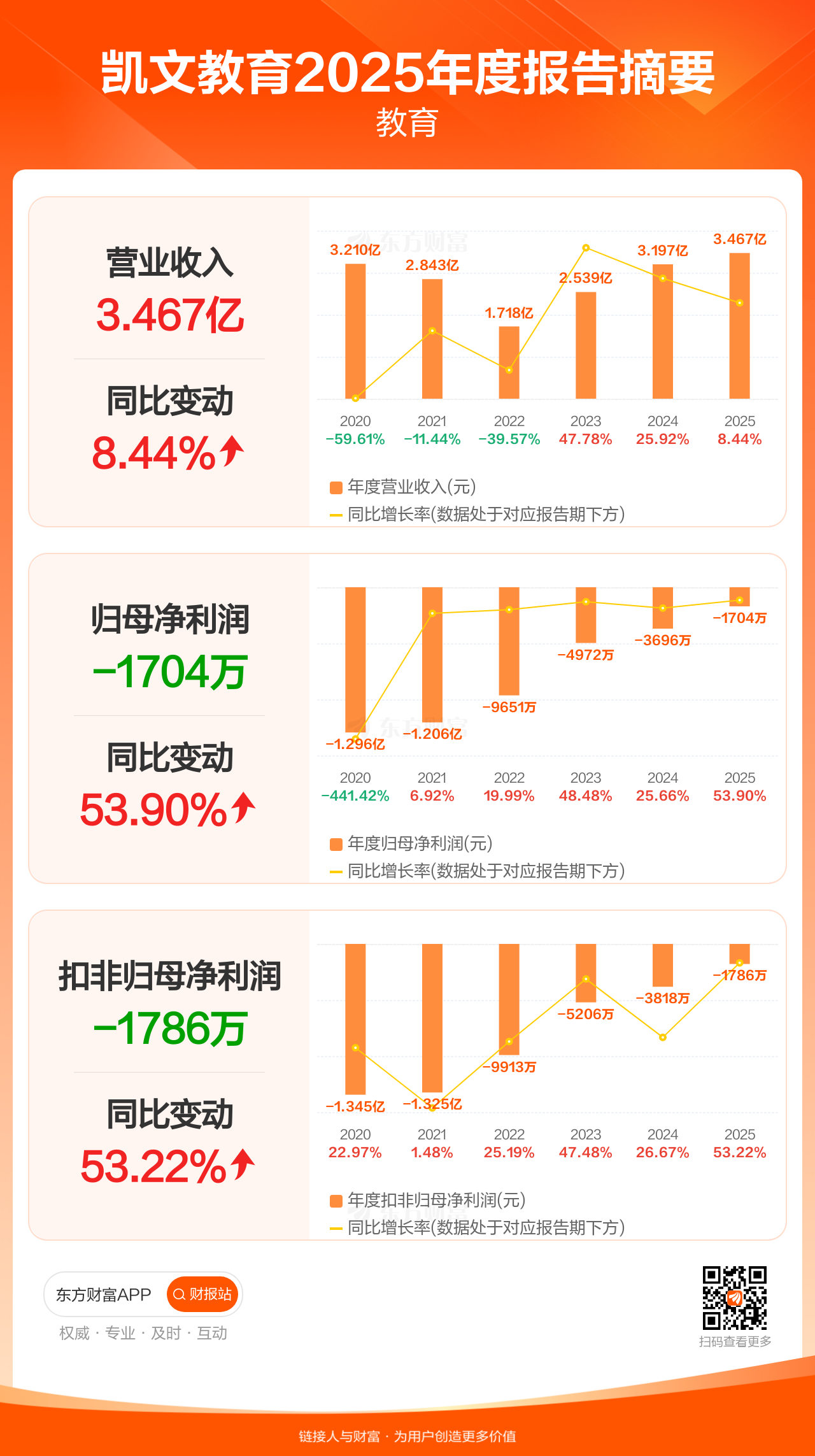 凯文教育4月25日发布2025年年报显示,公司全年实现营业收入3.47亿元,同比增长8.44%;归母净利润-1703.91万元;扣非归母净利润-1785.90万元。