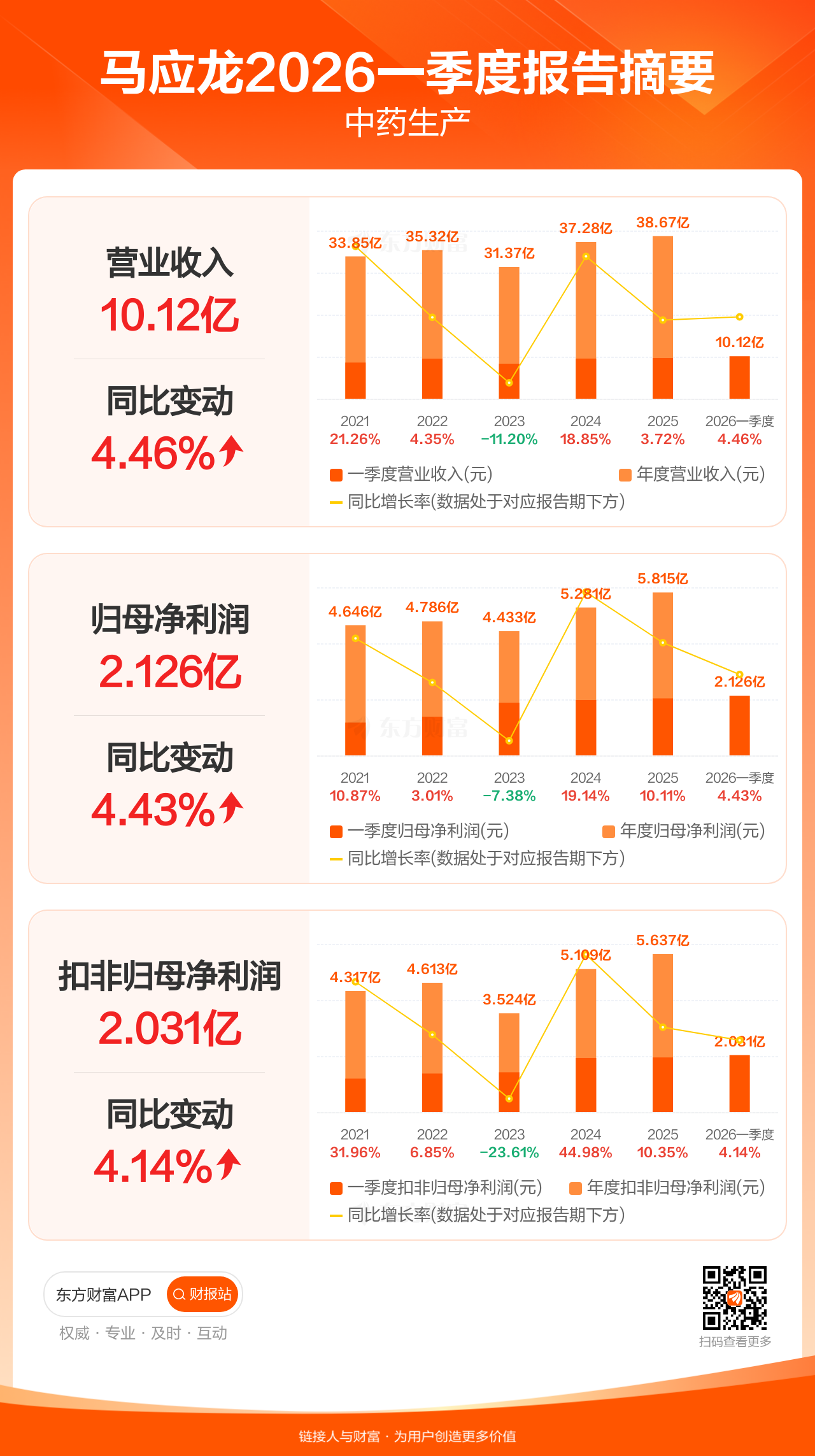 马应龙4月25日发布2026年一季报显示,公司一季度实现营业收入10.12亿元,同比增长4.46%;归母净利润2.13亿元,同比增长4.43%;扣非归母净利润2.03亿元,同比增长4.14%。