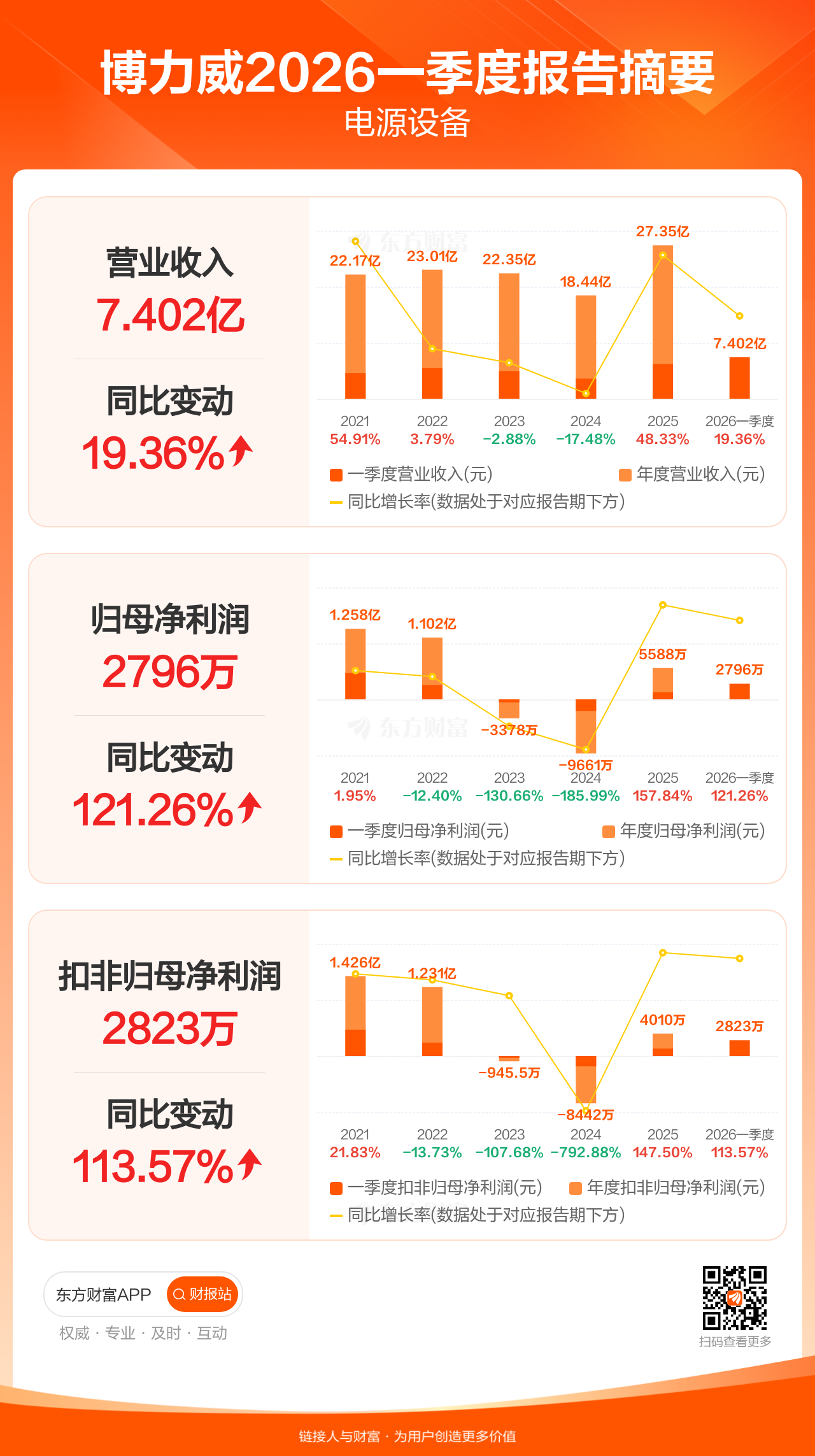 博力威4月25日发布2026年一季报显示,公司一季度实现营业收入7.40亿元,同比增长19.36%;归母净利润2795.73万元,同比增长121.26%;扣非归母净利润2822.70万元,同比增长113.57%。