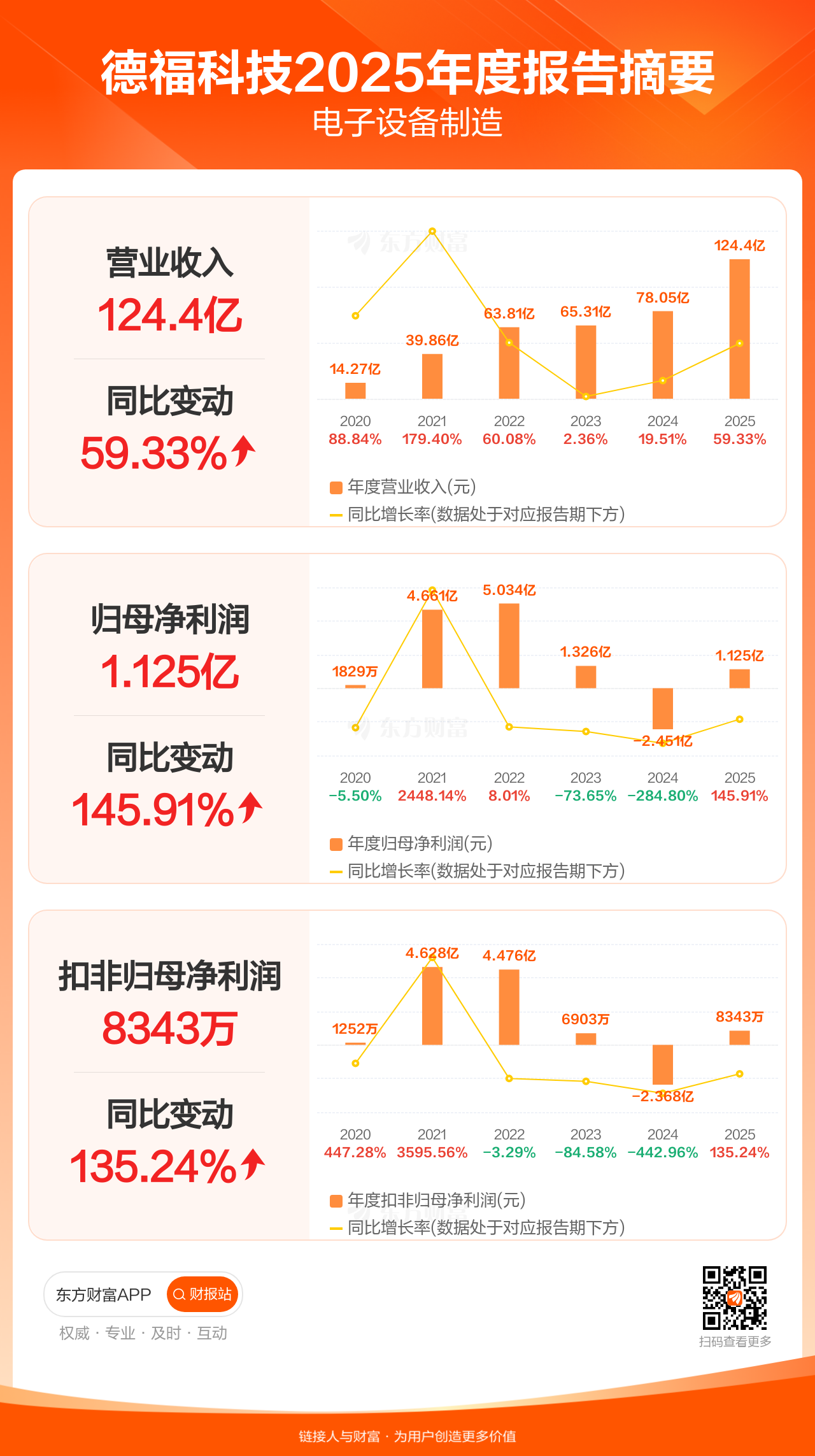 德福科技4月25日发布2025年年报显示,公司全年实现营业收入124.37亿元,同比增长59.33%;归母净利润1.13亿元,同比增长145.91%;扣非归母净利润8343.00万元,同比增长135.24%。