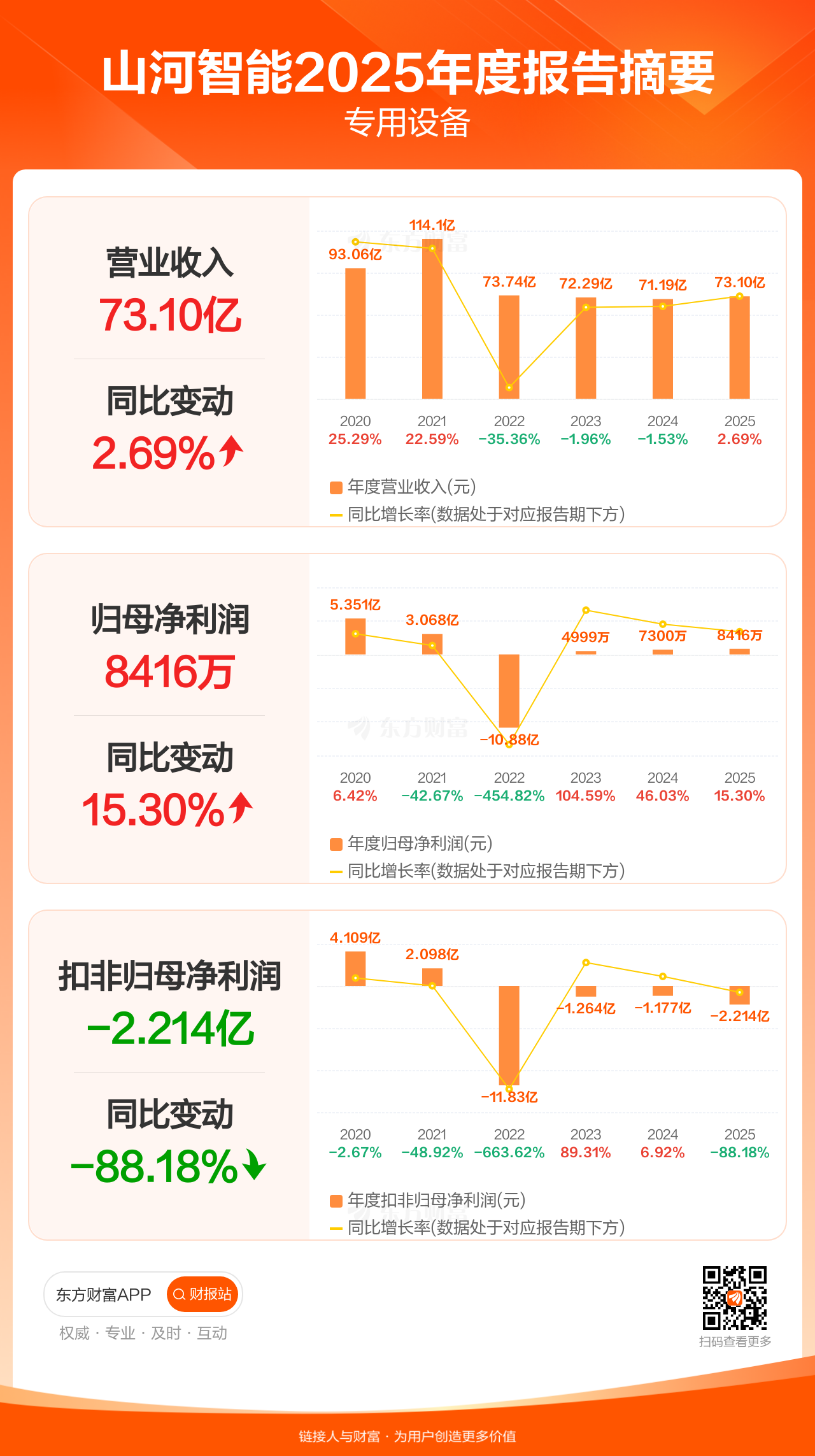 山河智能4月25日发布2025年年报显示,公司全年实现营业收入73.10亿元,同比增长2.69%;归母净利润8416.19万元,同比增长15.30%;扣非归母净利润-2.21亿元。