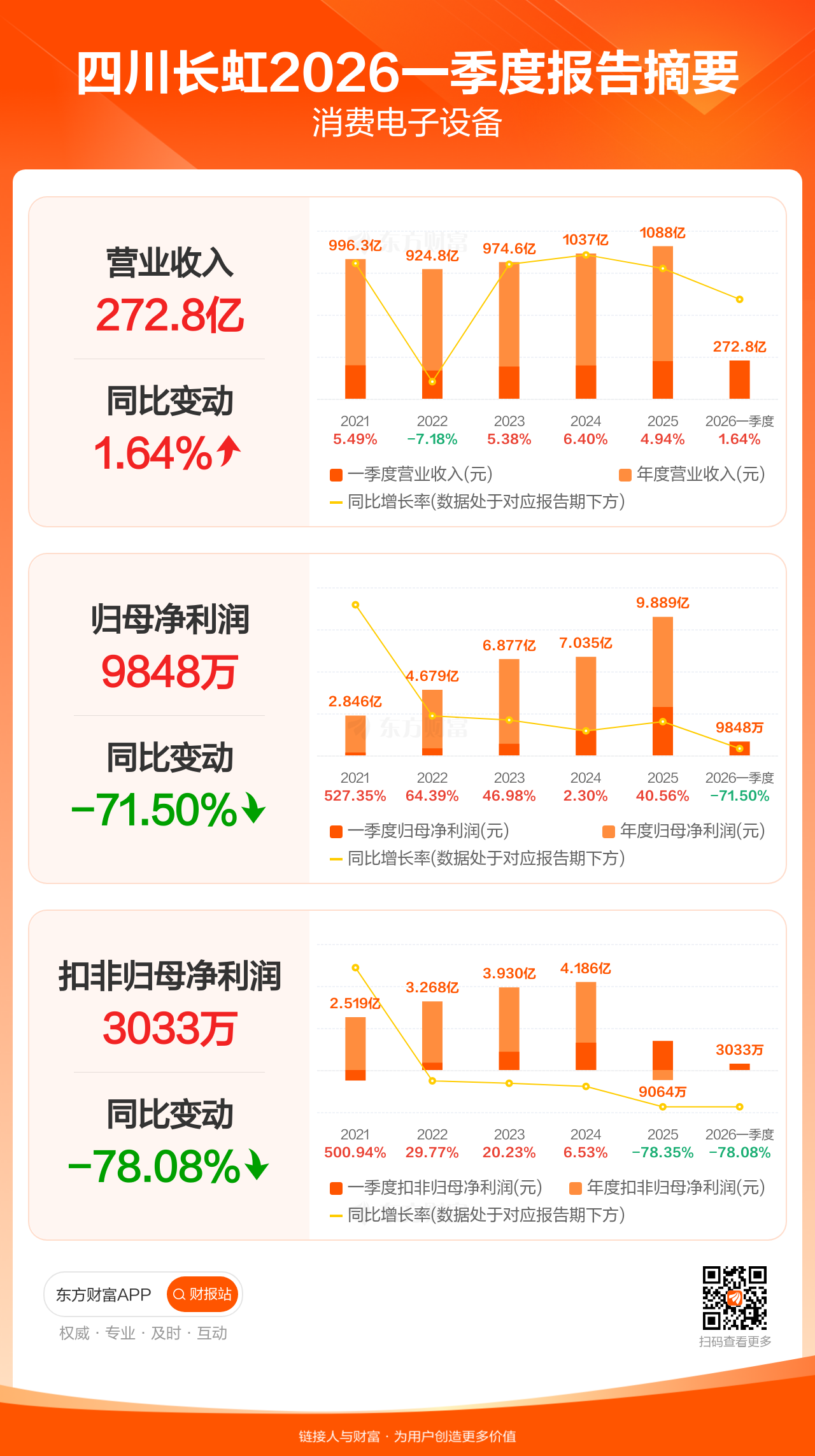 四川长虹4月25日发布2026年一季报显示,公司一季度实现营业收入272.76亿元,同比增长1.64%;归母净利润9847.83万元,同比下滑71.50%;扣非归母净利润3033.50万元,同比下滑78.08%。