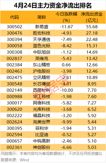 据数据宝统计,今日有74股资金净流出均超2亿元,其中,新易盛、胜宏科技、天孚通信、蓝色光标、中际旭创、英维克、东山精密、沪电股份、立讯精密流出金额居前,均超10亿元。