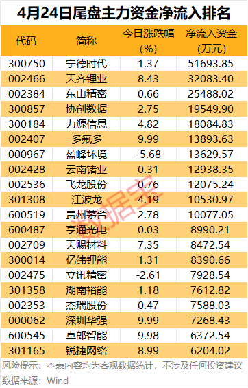 个股方面,11股尾盘主力资金净流入均超1亿元,宁德时代、天齐锂业、东山精密尾盘主力资金净流入居前,金额分别为5.17亿元、3.21亿元、2.55亿元。