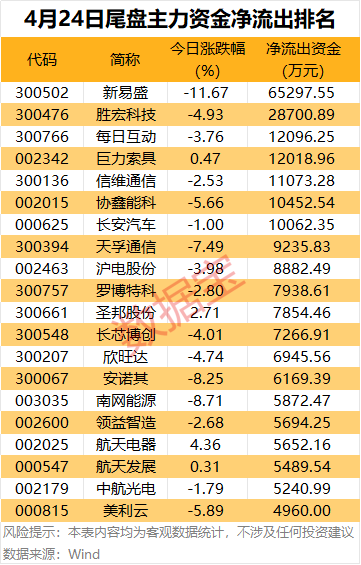 尾盘主力资金净流出方面,新易盛、胜宏科技尾盘主力资金净流出超2亿元,每日互动、巨力索具、信维通信、协鑫能科等个股主力资金净流出均超1亿元。