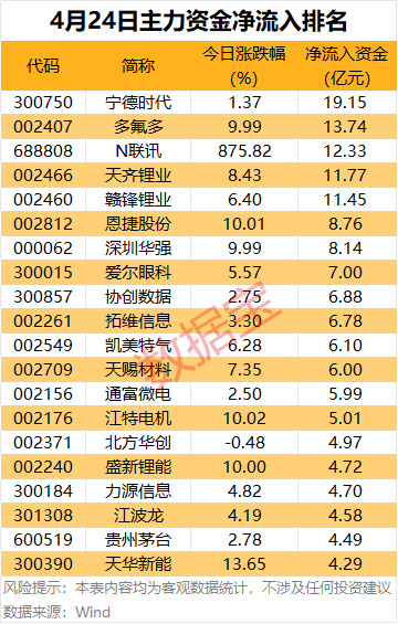 宁德时代、多氟多、天齐锂业、赣锋锂业主力资金分别净流入19.15亿元、13.74亿元 、11.77亿元、11.45亿元。