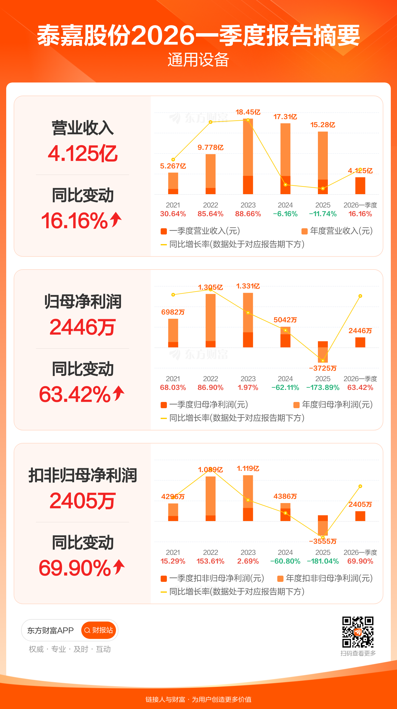 泰嘉股份4月25日发布2026年一季报显示,公司一季度实现营业收入4.13亿元,同比增长16.16%;归母净利润2446.39万元,同比增长63.42%;扣非归母净利润2404.75万元,同比增长69.90%。