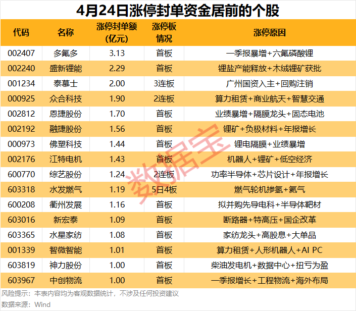 以封单金额计算,多氟多、盛新锂能、泰慕士涨停板封单资金居前,分别达3.13亿元、2.29亿元、2亿元。