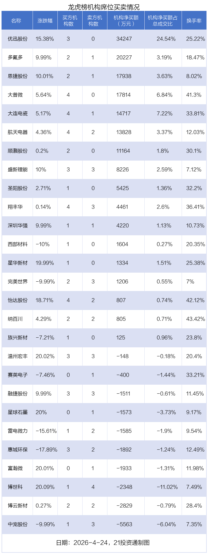 4月24日,27只个股龙虎榜出现了机构的身影,机构合计净买入13.84亿元。具体来看,机构净买入17股,净卖出10股。