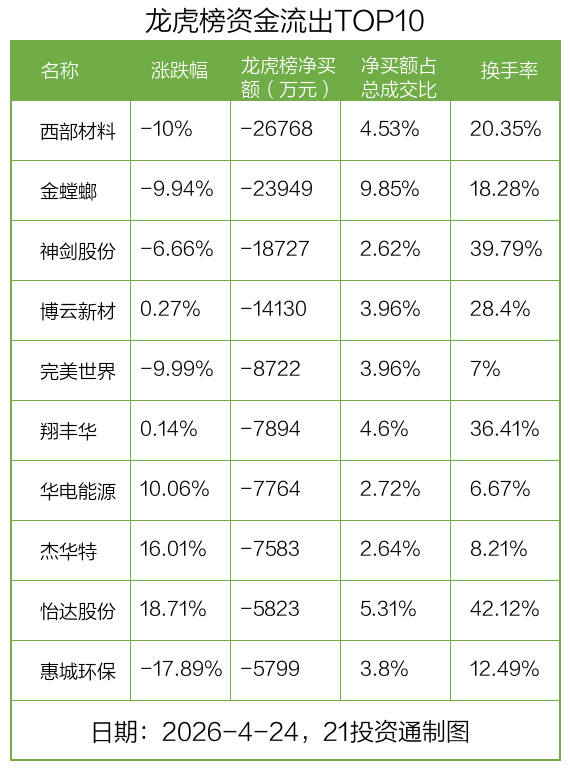 而龙虎榜中资金净流出最多的是西部材料(002149.SZ),被净卖出为2.68亿元,占总成交金额的4.53%。西部材料收盘下跌10%,换手率为20.35%。