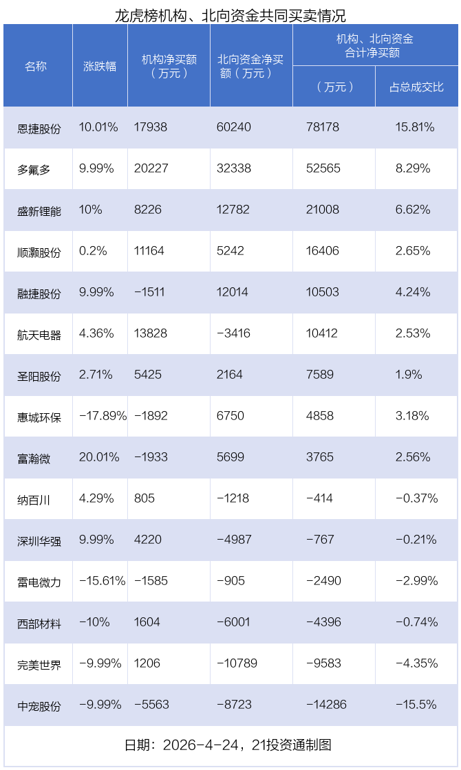 值得注意的是,机构和北向资金共同净买入了恩捷股份、多氟多、盛新锂能、顺灏股份、圣阳股份等5股;共同净卖出了雷电微力、中宠股份等2股;在融捷股份,惠城环保,富瀚微,纳百川,航天电器,深圳华强,西部材料,完美世界上出现分歧,机构净卖出融捷股份1510.91万元,北向资金净买入1.2亿元;机构净卖出惠城环保1892.18万元,北向资金净买入6749.97万元;机构净卖出富瀚微1933.21万元,北向资金净买入5698.59万元;机构净买入纳百川804.79万元,北向资金净卖出1218.44万元;机构净买入航天电器1.38亿元,北向资金净卖出3415.65万元;机构净买入深圳华强4220.38万元,北向资金净卖出4987.31万元;机构净买入西部材料1604.4万元,北向资金净卖出6000.7万元;机构净买入完美世界1206.49万元,北向资金净卖出1.08亿元。
