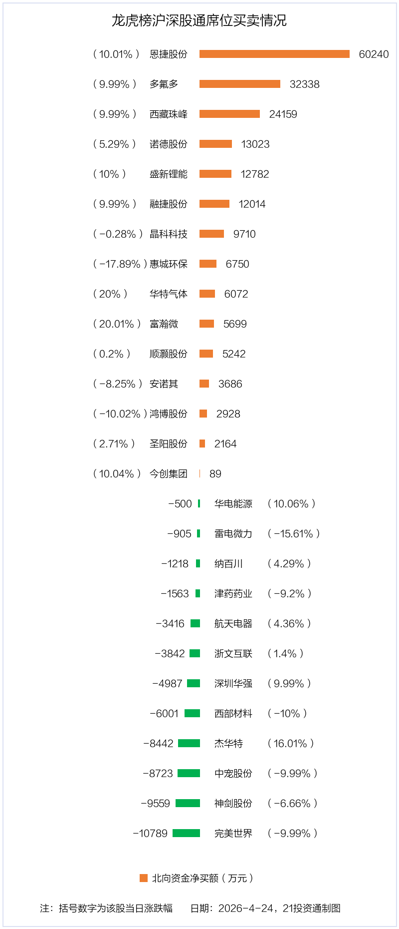 4月24日,北向资金参与龙虎榜中的个股共有27只,合计净买入13.69亿元。其中沪股通净买入5股,净卖出4股,合计净买入3.87亿元;深股通净买入10股,净卖出8股,合计净买入9.82亿元。