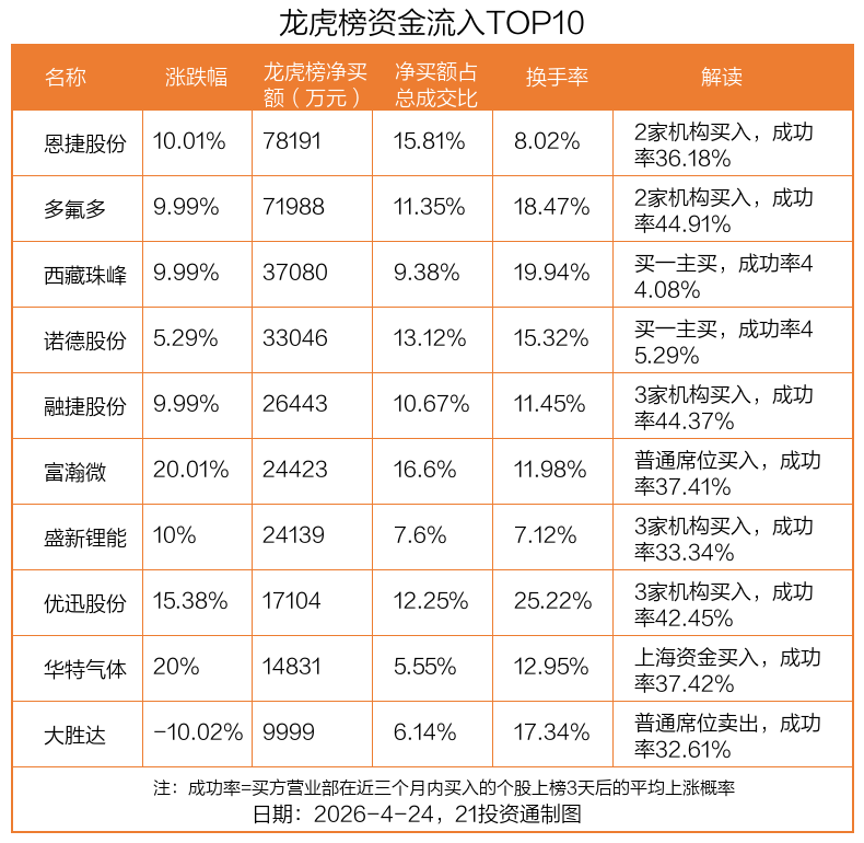 4月24日,上证指数下跌0.33%,深证成指下跌0.69%,创业板指下跌1.41%。盘后龙虎榜数据显示,共有55只个股因当日异动登上龙虎榜,资金净流入最多的是恩捷股份(002812.SZ),达7.82亿元。