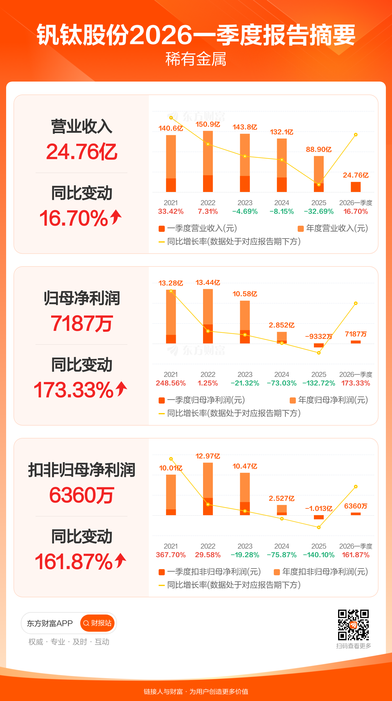 钒钛股份4月25日发布2026年一季报显示,公司一季度实现营业收入24.76亿元,同比增长16.70%;归母净利润7186.84万元,同比增长173.33%;扣非归母净利润6359.50万元,同比增长161.87%。