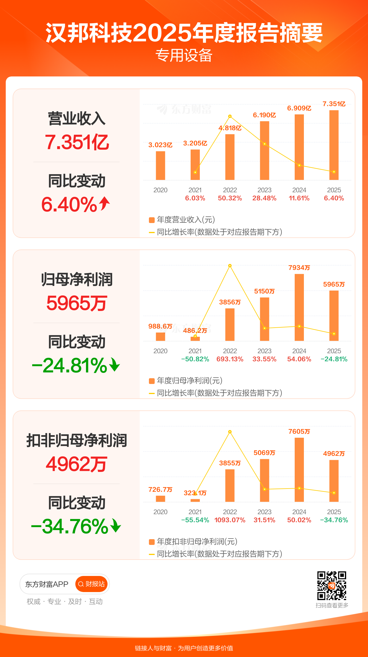 汉邦科技4月25日发布2025年年报显示,公司全年实现营业收入7.35亿元,同比增长6.40%;归母净利润5965.13万元,同比下滑24.81%;扣非归母净利润4961.59万元,同比下滑34.76%。
