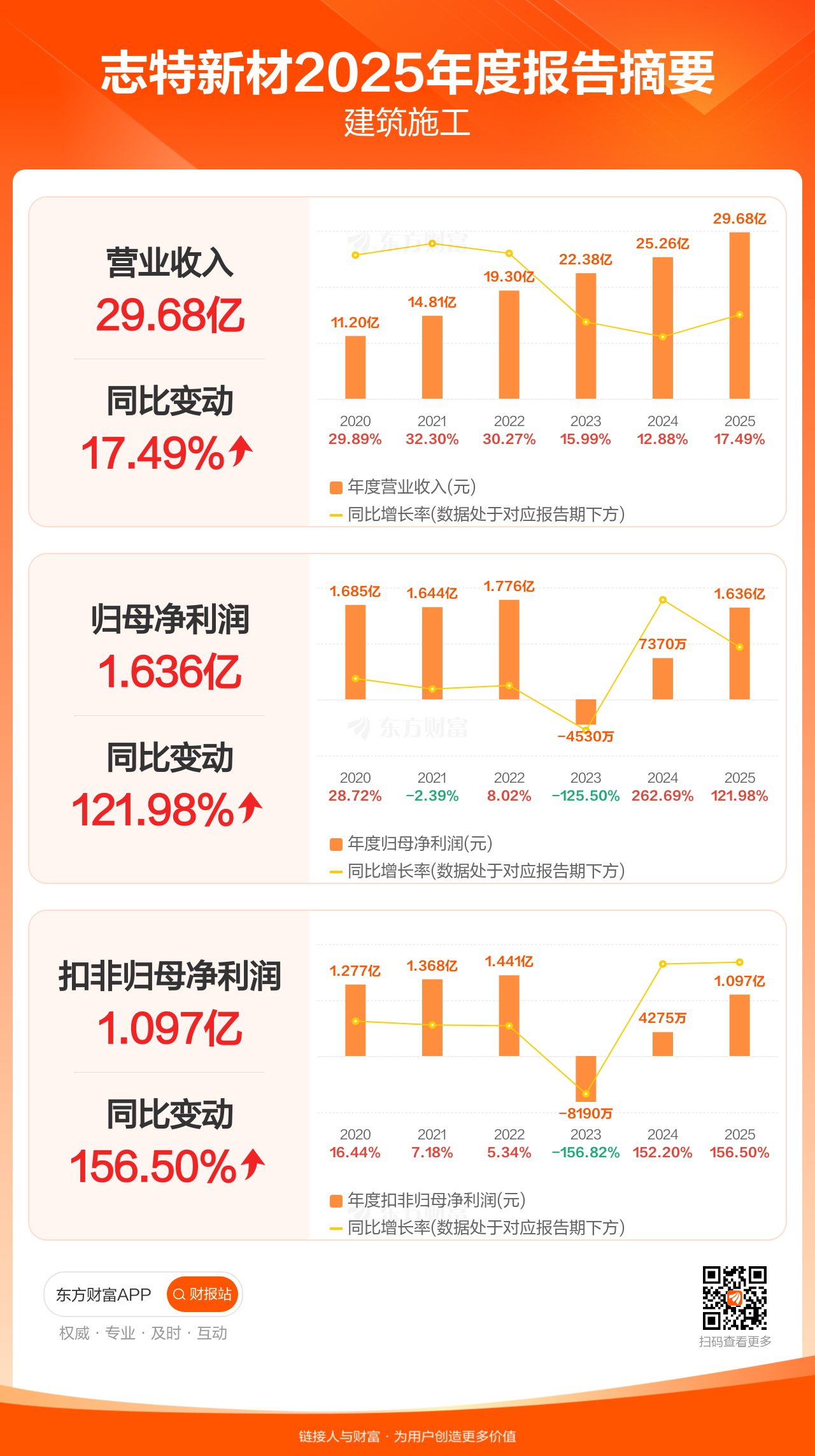 志特新材4月25日发布2025年年报显示,公司全年实现营业收入29.68亿元,同比增长17.49%;归母净利润1.64亿元,同比增长121.98%;扣非归母净利润1.10亿元,同比增长156.50%。
