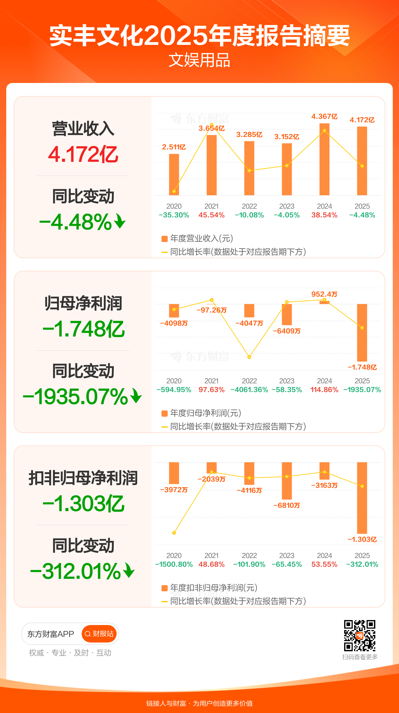 实丰文化4月25日发布2025年年报显示,公司全年实现营业收入4.17亿元,同比下滑4.48%;归母净利润-1.75亿元;扣非归母净利润-1.30亿元。