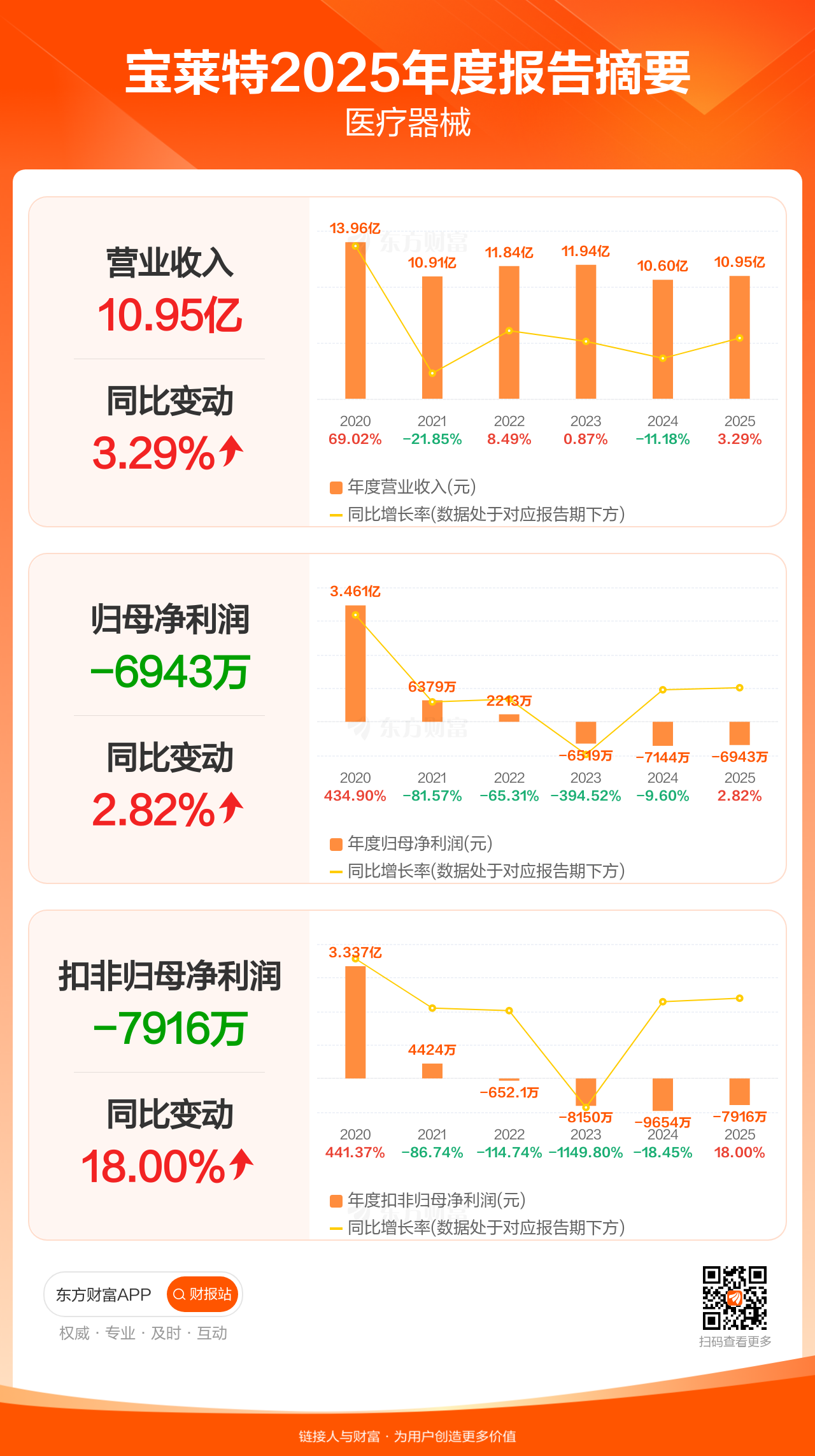 宝莱特4月25日发布2025年年报显示,公司全年实现营业收入10.95亿元,同比增长3.29%;归母净利润-6942.78万元;扣非归母净利润-7916.36万元。
