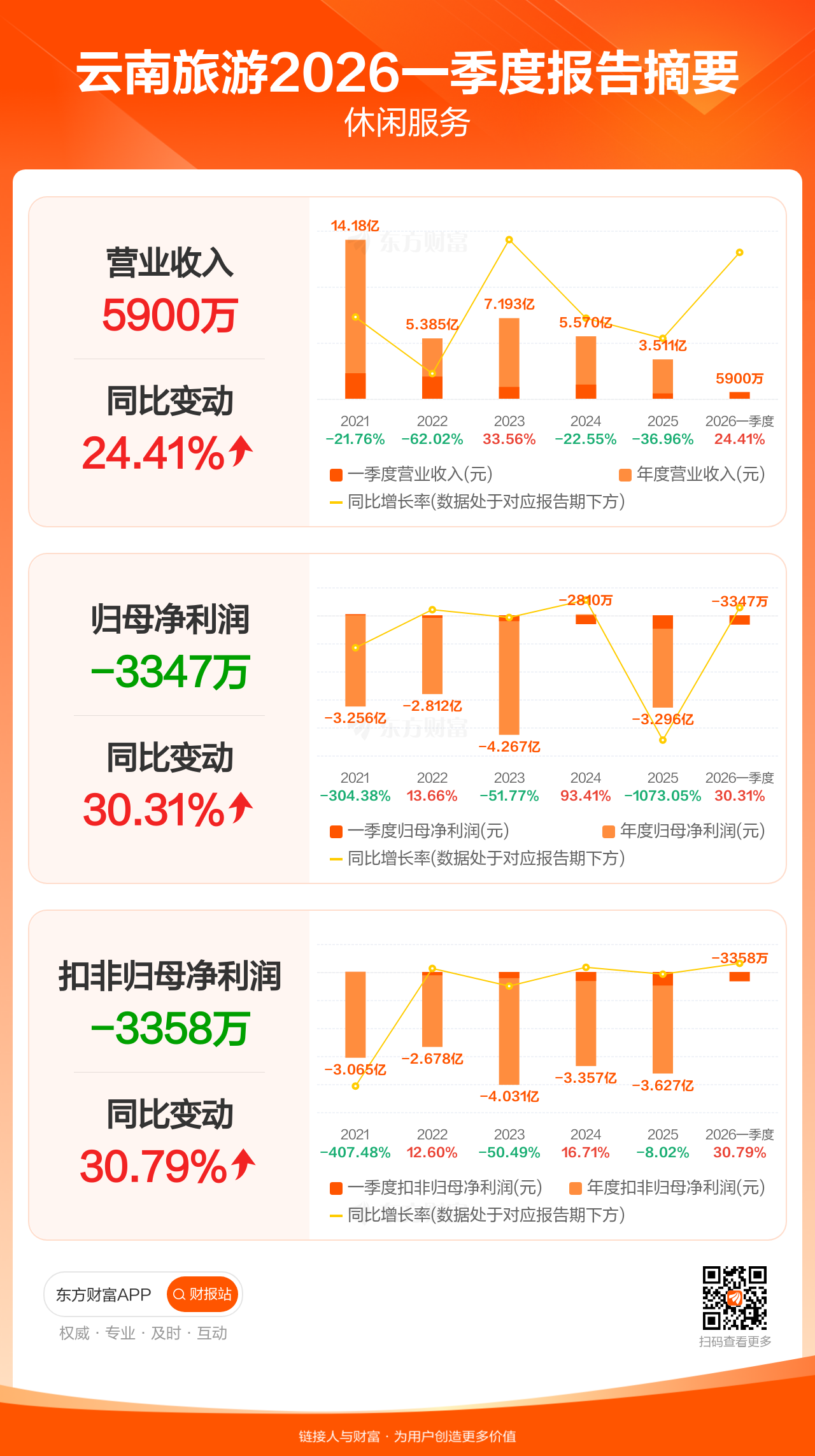 云南旅游4月25日发布2026年一季报显示,公司一季度实现营业收入5899.96万元,同比增长24.41%;归母净利润-3346.86万元;扣非归母净利润-3357.53万元。