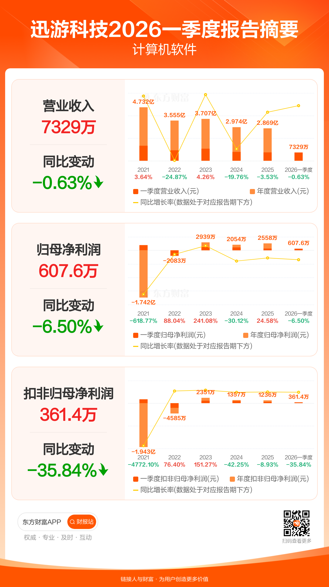 迅游科技4月25日发布2026年一季报显示,公司一季度实现营业收入7329.10万元,同比下滑0.63%;归母净利润607.58万元,同比下滑6.50%;扣非归母净利润361.40万元,同比下滑35.84%。