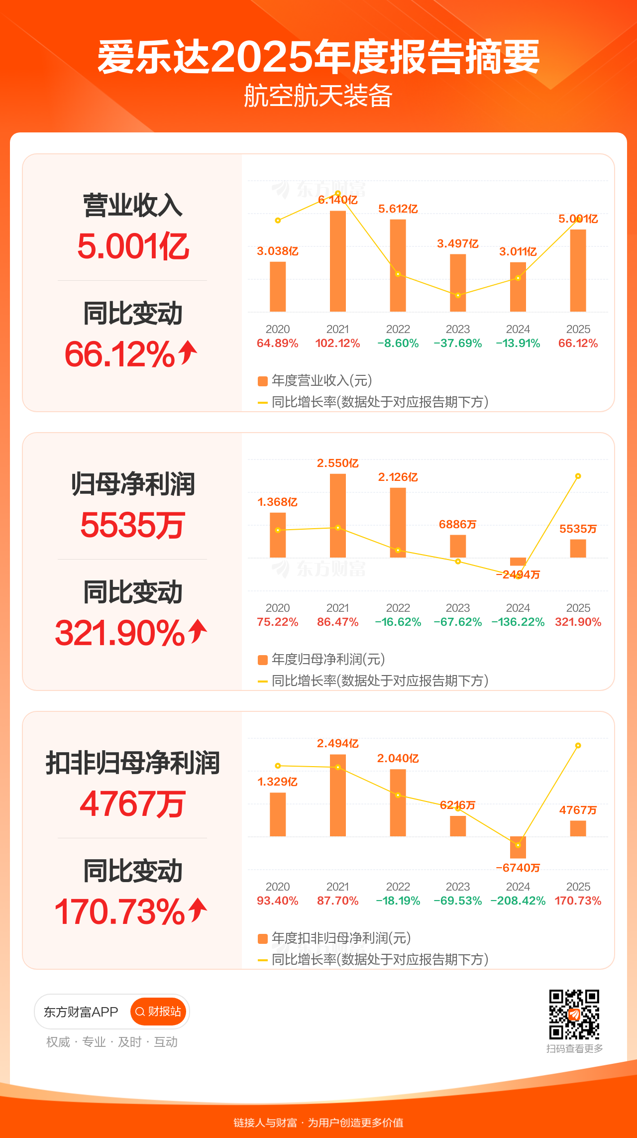 爱乐达4月25日发布2025年年报显示,公司全年实现营业收入5.00亿元,同比增长66.12%;归母净利润5534.79万元,同比增长321.90%;扣非归母净利润4766.86万元,同比增长170.73%。
