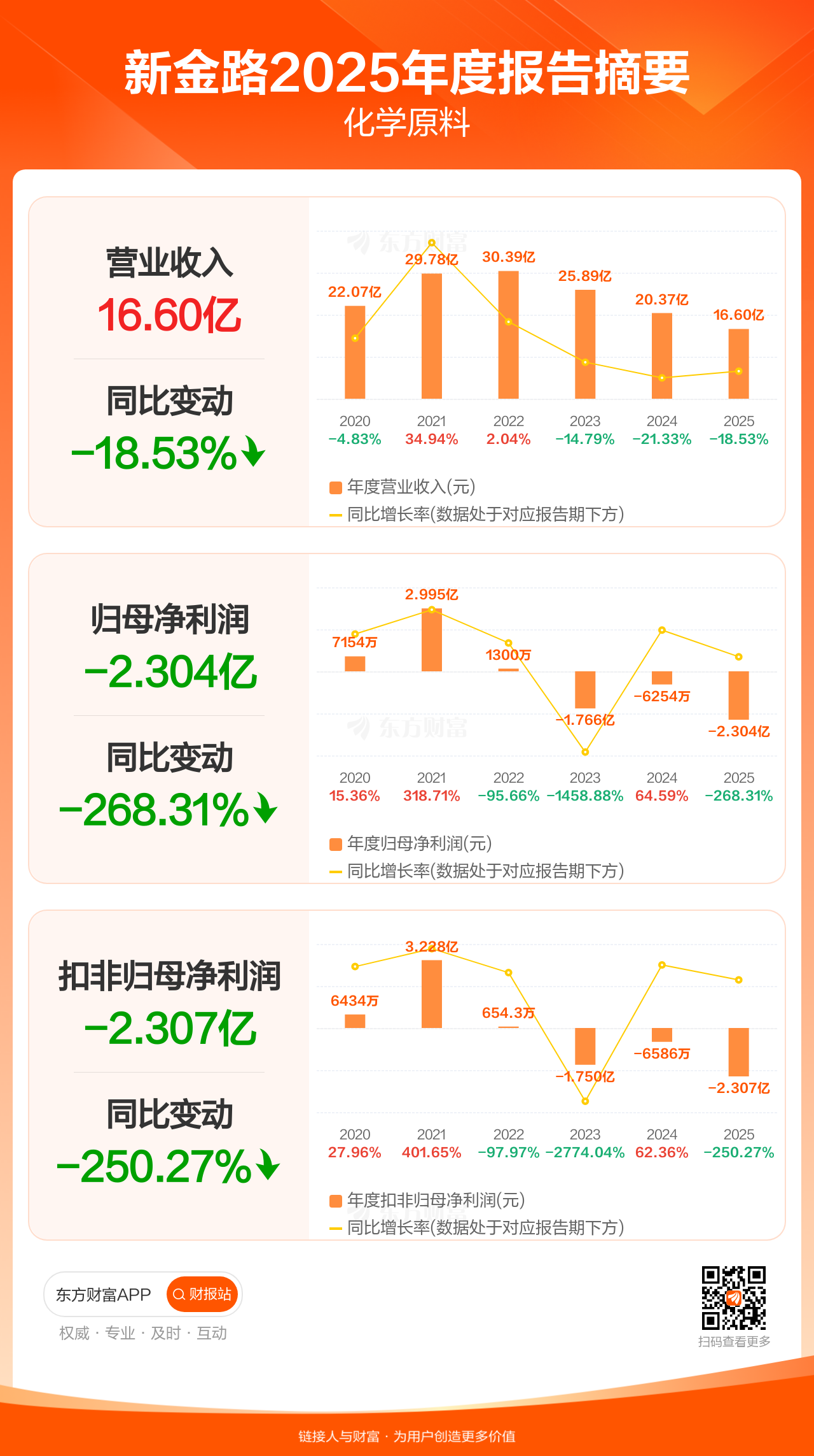 新金路4月25日发布2025年年报显示,公司全年实现营业收入16.60亿元,同比下滑18.53%;归母净利润-2.30亿元;扣非归母净利润-2.31亿元。