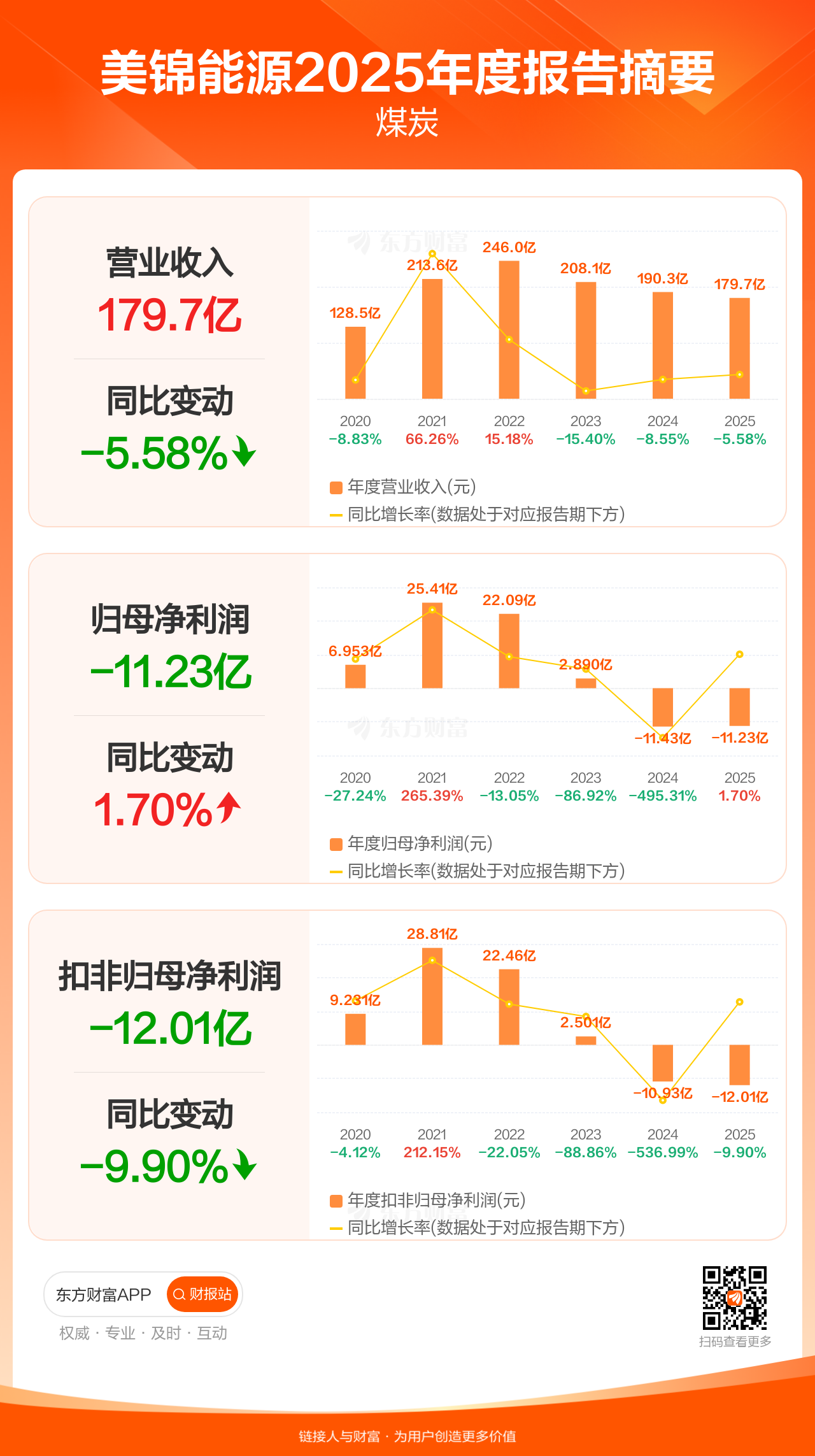 美锦能源4月25日发布2025年年报显示,公司全年实现营业收入179.69亿元,同比下滑5.58%;归母净利润-11.23亿元;扣非归母净利润-12.01亿元。