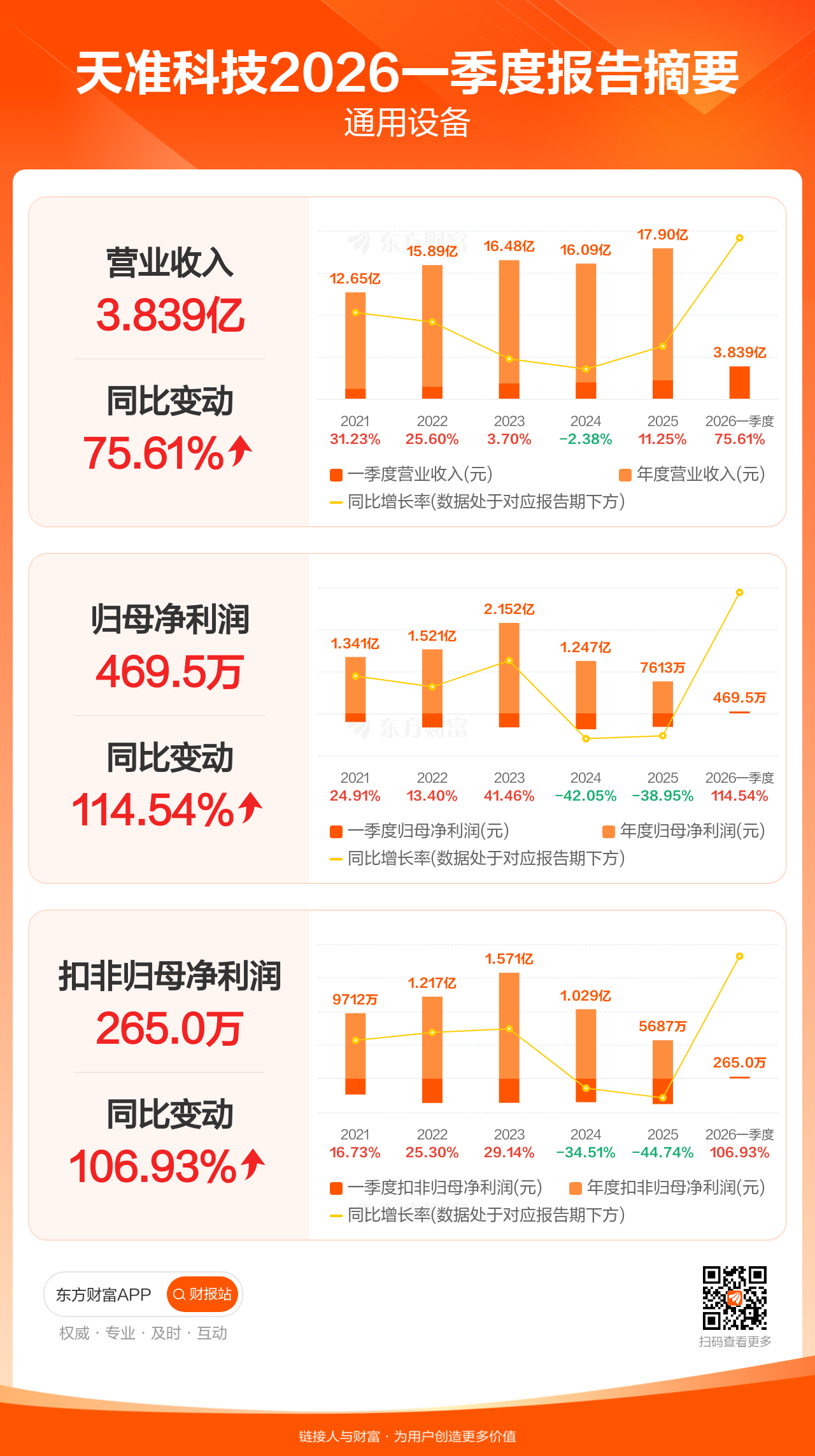天准科技4月25日发布2026年一季报显示,公司一季度实现营业收入3.84亿元,同比增长75.61%;归母净利润469.47万元,同比增长114.54%;扣非归母净利润265.01万元,同比增长106.93%。