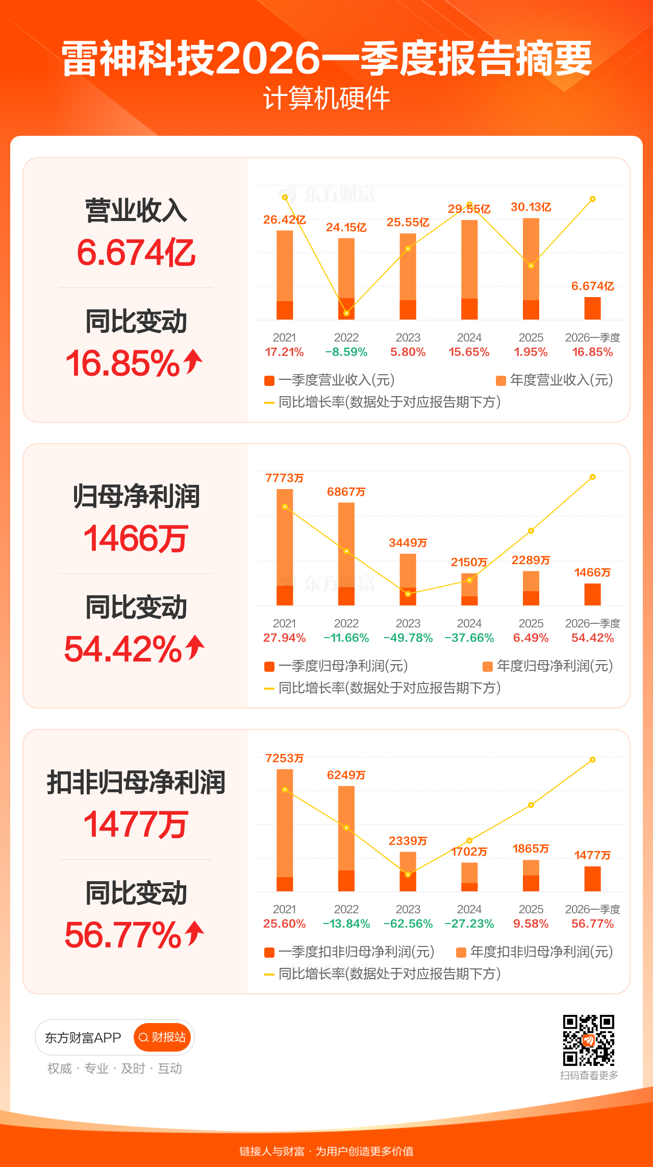 雷神科技4月24日发布2026年一季报显示,公司一季度实现营业收入6.67亿元,同比增长16.85%;归母净利润1466.08万元,同比增长54.42%;扣非归母净利润1476.66万元,同比增长56.77%。