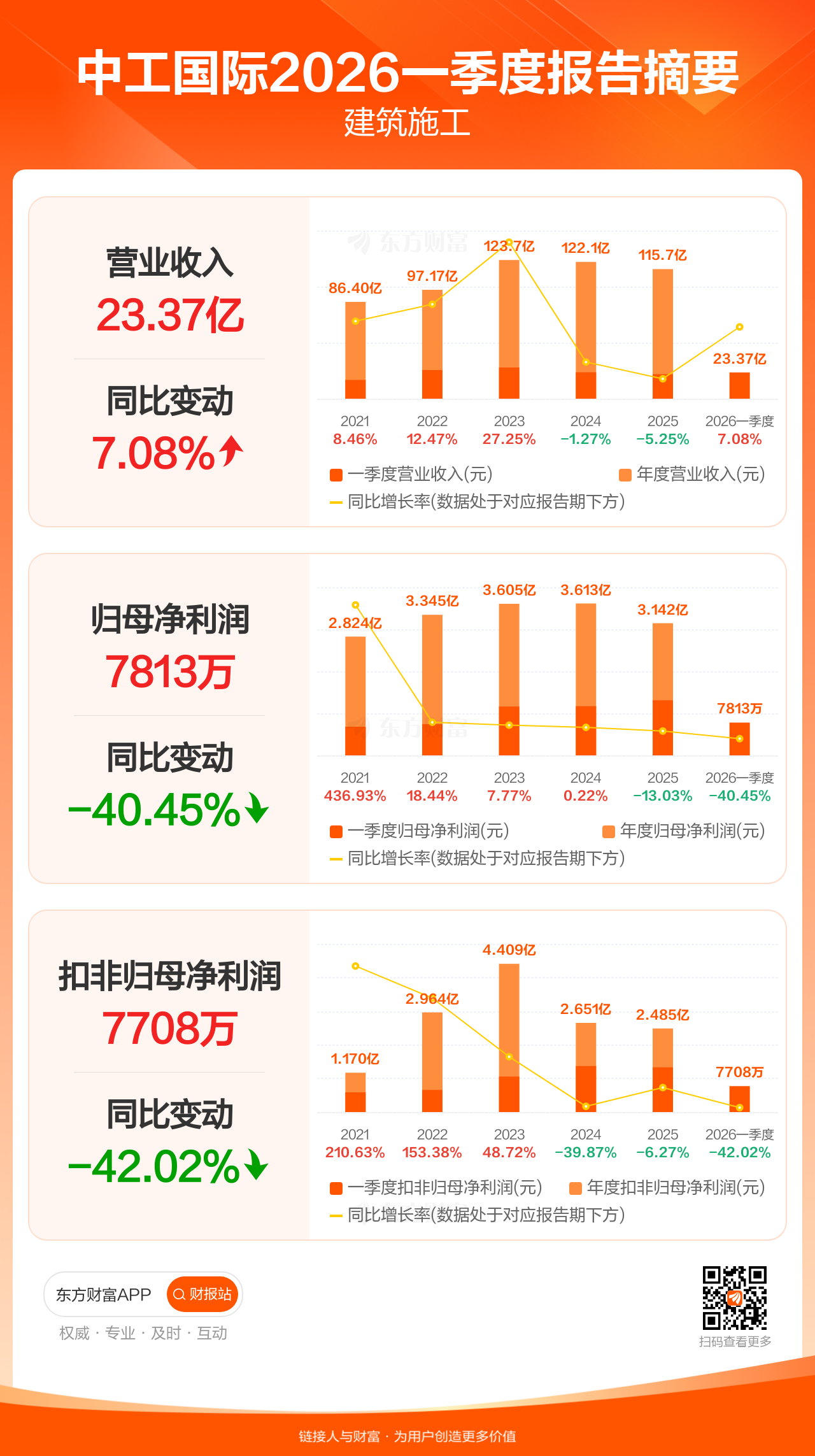 中工国际4月25日发布2026年一季报显示,公司一季度实现营业收入23.37亿元,同比增长7.08%;归母净利润7812.54万元,同比下滑40.45%;扣非归母净利润7708.27万元,同比下滑42.02%。