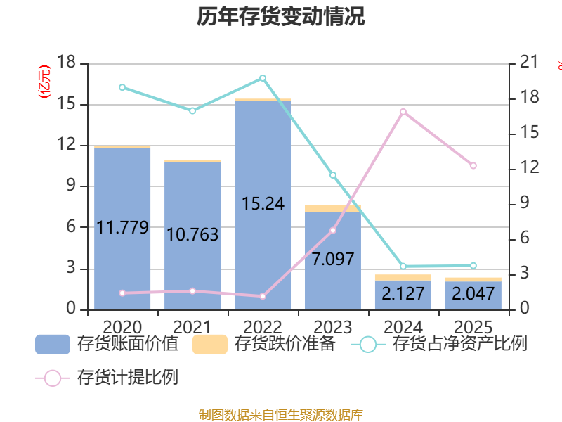 从存货变动来看,截至2025年末,公司存货账面价值为2.05亿元,占净资产的3.74%,较上年末减少802.71万元。其中,存货跌价准备为2863.82万元,计提比例为12.27%。