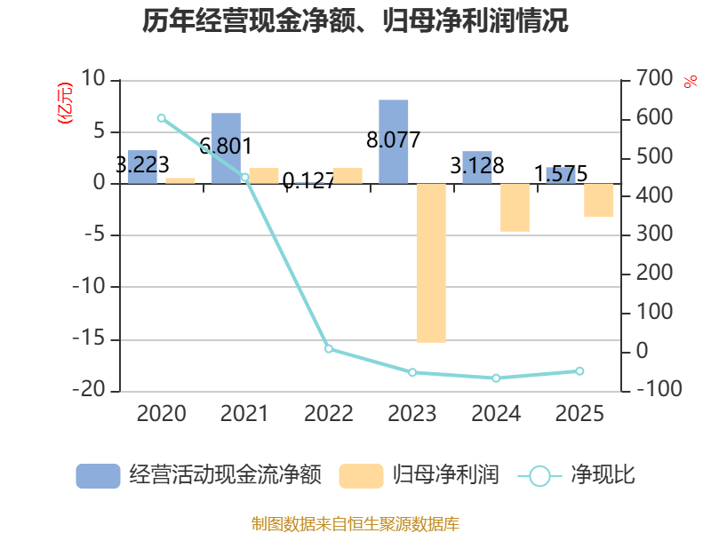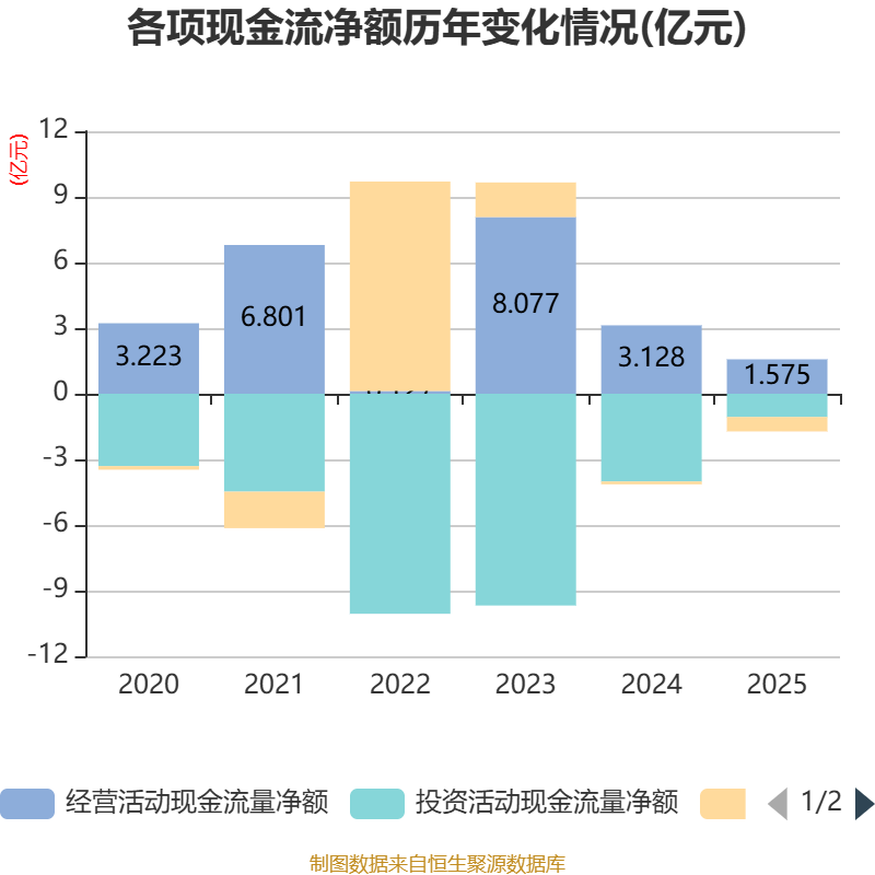 截至2025年,公司经营活动现金流净额为1.57亿元,同比下降49.65%;筹资活动现金流净额-6607.93万元,同比减少5327.14万元;投资活动现金流净额-1.06亿元,上年同期为-4.01亿元。