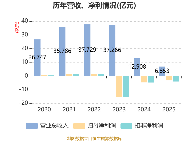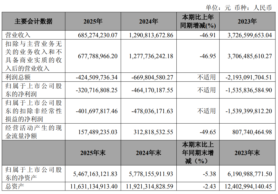 中证智能财讯宝泰隆(601011)4月25日披露2025年年度报告。2025年,公司实现营业总收入6.85亿元,同比下降46.91%;归母净利润亏损3.21亿元,上年同期亏损4.64亿元;扣非净利润亏损4.02亿元,上年同期亏损4.78亿元;经营活动产生的现金流量净额为1.57亿元,同比下降49.65%;报告期内,宝泰隆基本每股收益为-0.17元,加权平均净资产收益率为-5.69%。