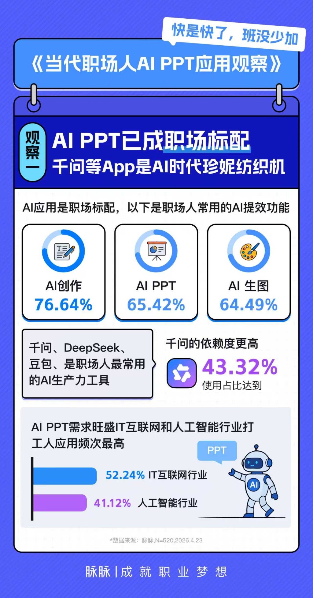 4月24日,脉脉官方微博发布的一份职场PPT报告称,AI工具已成当代职场人日常工作和求职标配,千问、DeepSeek等AI工具最受欢迎,其中千问的AI PPT功能“用户依赖度”最高,高频使用占比达到43%。