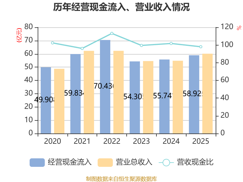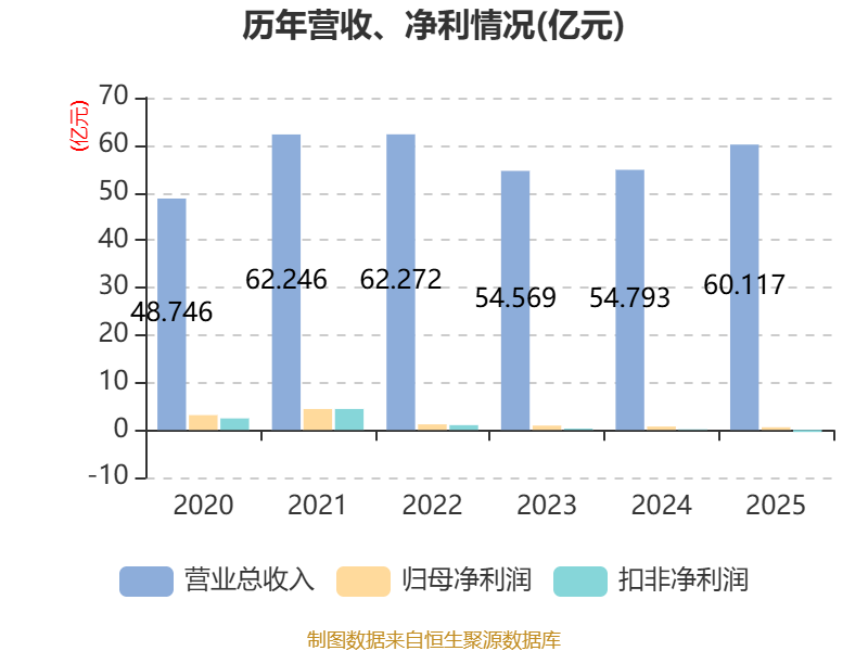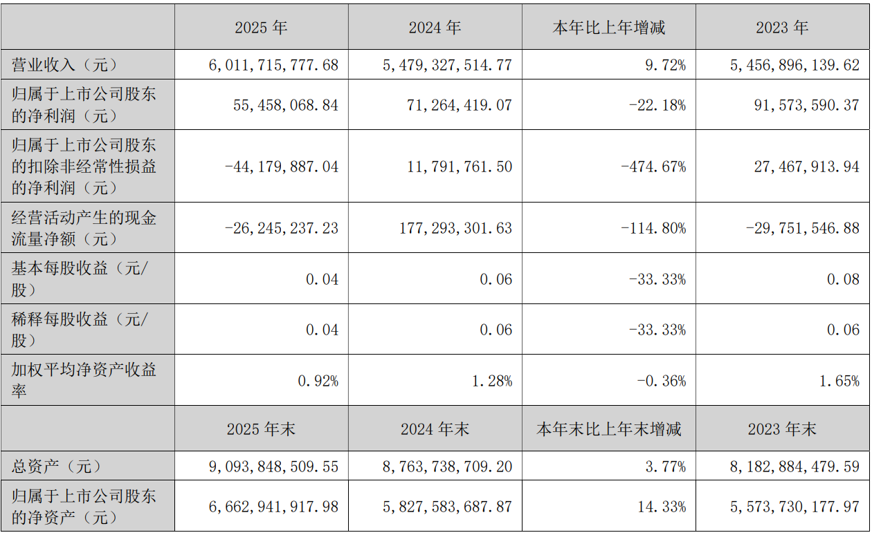 中证智能财讯景兴纸业(002067)4月25日披露2025年年度报告。2025年,公司实现营业总收入60.12亿元,同比增长9.72%;归母净利润5545.81万元,同比下降22.18%;扣非净利润亏损4417.99万元,上年同期盈利1179.18万元;经营活动产生的现金流量净额为-2624.52万元,上年同期为1.77亿元;报告期内,景兴纸业基本每股收益为0.04元,加权平均净资产收益率为0.92%。公司2025年度分配预案为:拟向全体股东每10股派现0.1元(含税)。