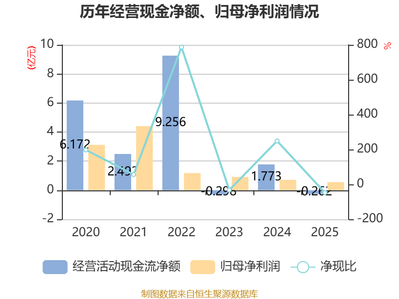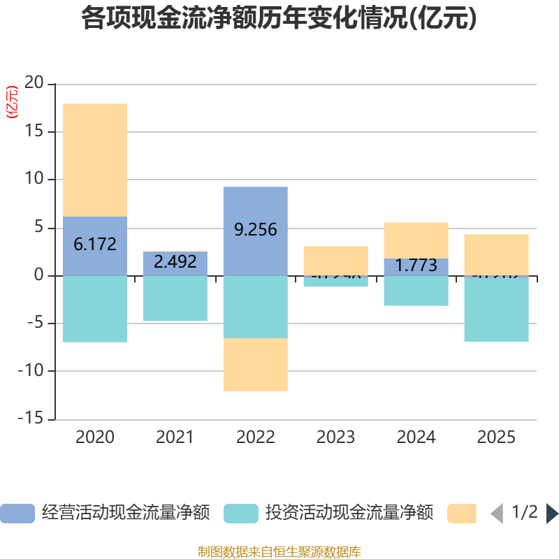 截至2025年,公司经营活动现金流净额为-2624.52万元,同比减少2.04亿元;筹资活动现金流净额4.29亿元,同比增加5407.25万元;投资活动现金流净额-6.66亿元,上年同期为-3.16亿元。