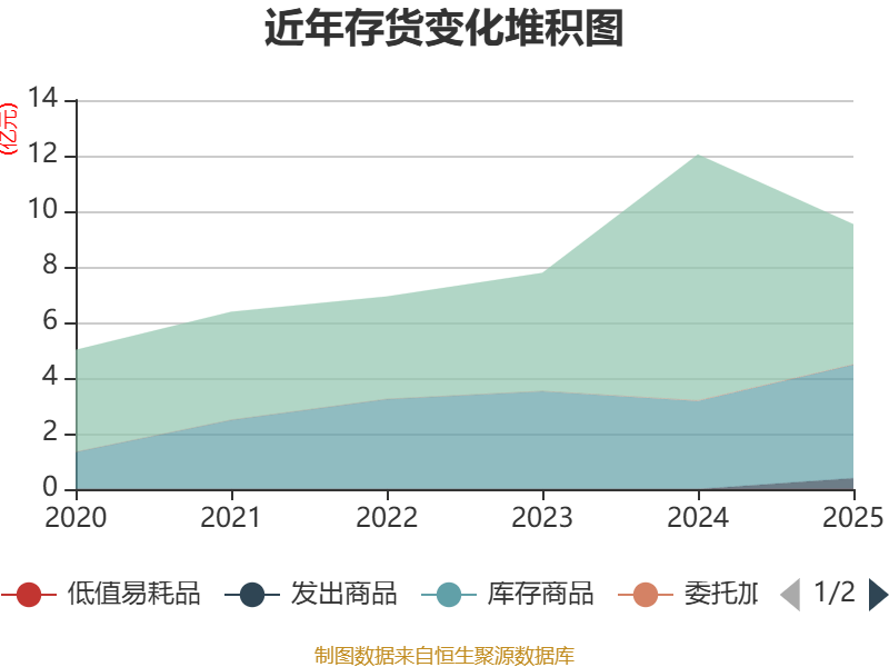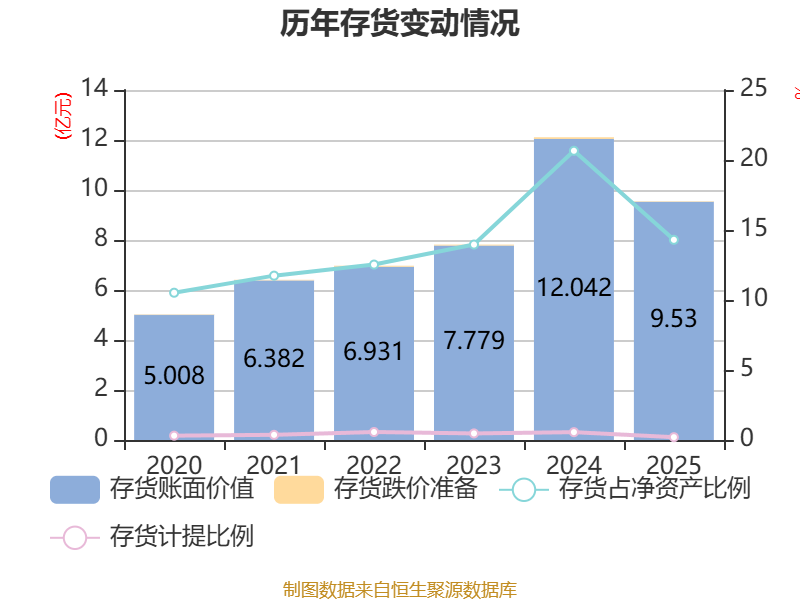 从存货变动来看,截至2025年末,公司存货账面价值为9.53亿元,占净资产的14.3%,较上年末减少2.51亿元。其中,存货跌价准备为189.42万元,计提比例为0.2%。