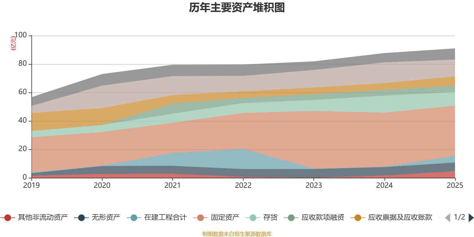 资产重大变化方面,截至2025年末,公司在建工程合计较上年末增加1369.75%,占公司总资产比重上升4.76个百分点;固定资产较上年末减少6.68%,占公司总资产比重下降4.36个百分点;货币资金较上年末减少18.78%,占公司总资产比重下降3.61个百分点;其他非流动资产较上年末增加212.49%,占公司总资产比重上升3.42个百分点。