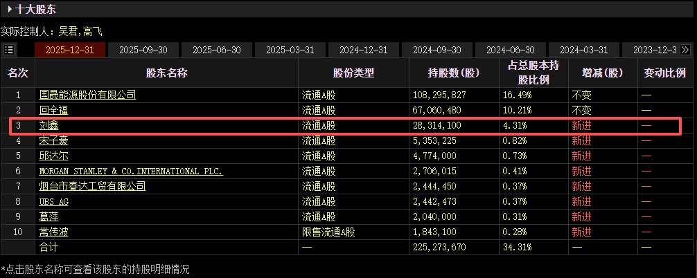 据国晟科技(603778.SH)年报显示,自然人刘鑫新进成为第三大股东,持有2831.41万股,占总股本比例4.31%。