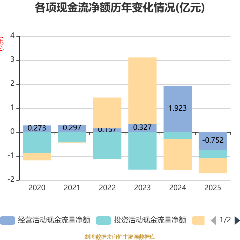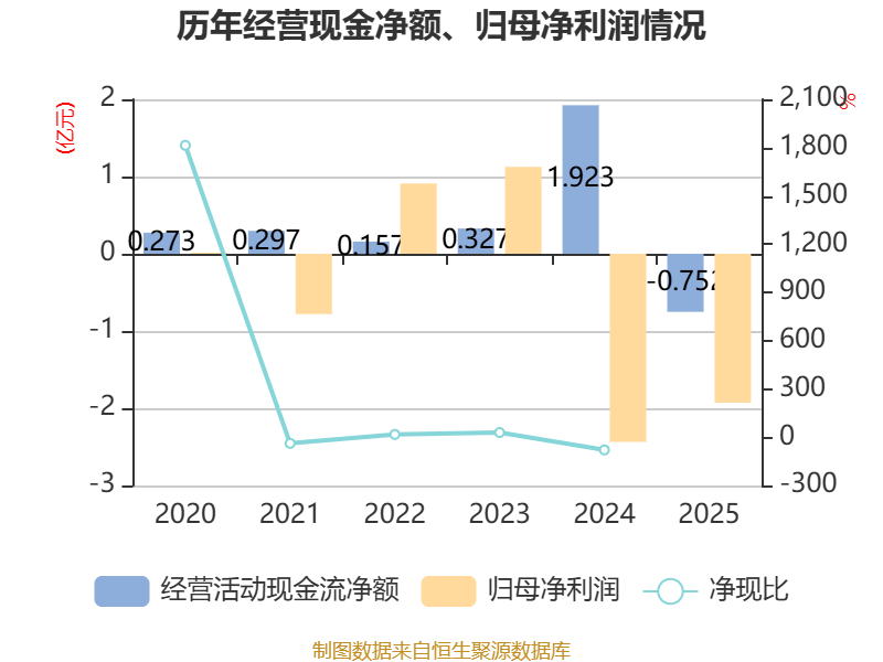 截至2025年,公司经营活动现金流净额为-7524.99万元,同比减少2.68亿元;筹资活动现金流净额-6291.57万元,同比增加6575.08万元;投资活动现金流净额-3441.79万元,上年同期为-2873.2万元。