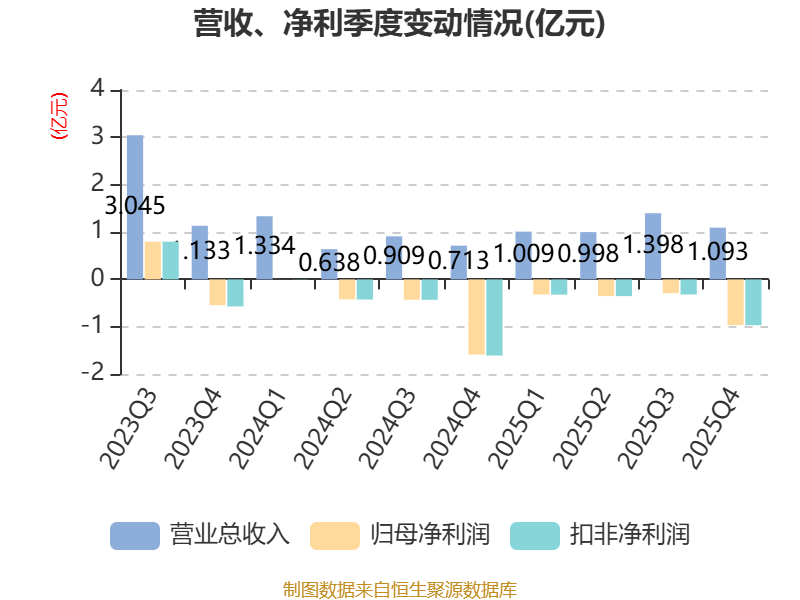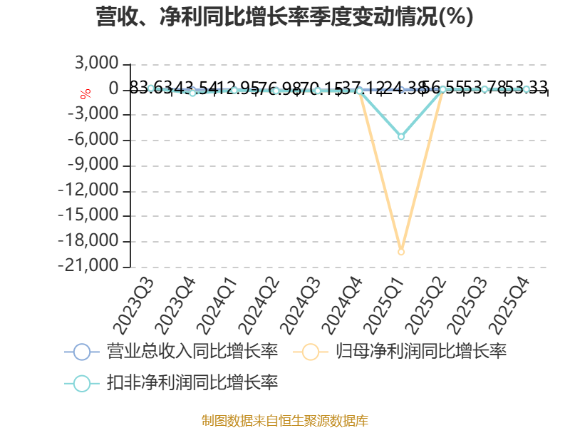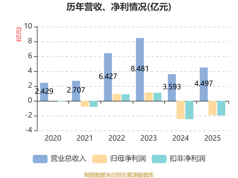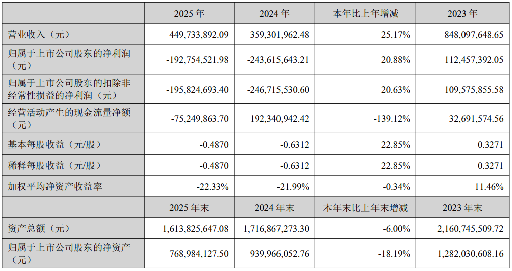 中证智能财讯岱勒新材(300700)4月25日披露2025年年度报告。2025年,公司实现营业总收入4.5亿元,同比增长25.17%;归母净利润亏损1.93亿元,上年同期亏损2.44亿元;扣非净利润亏损1.96亿元,上年同期亏损2.47亿元;经营活动产生的现金流量净额为-7524.99万元,上年同期为1.92亿元;报告期内,岱勒新材基本每股收益为-0.487元,加权平均净资产收益率为-22.33%。