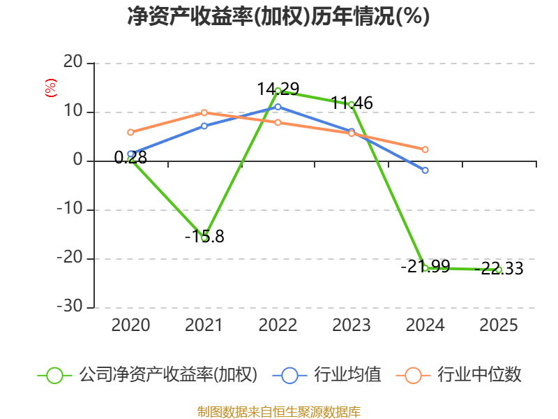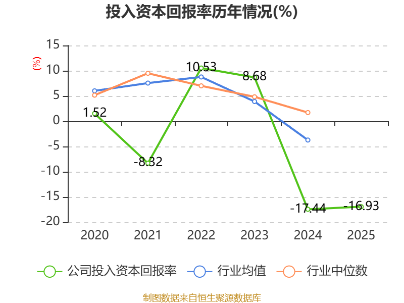 数据显示,2025年公司加权平均净资产收益率为-22.33%,较上年同期下降0.34个百分点。公司2025年投入资本回报率为-16.93%,较上年同期上升0.51个百分点。