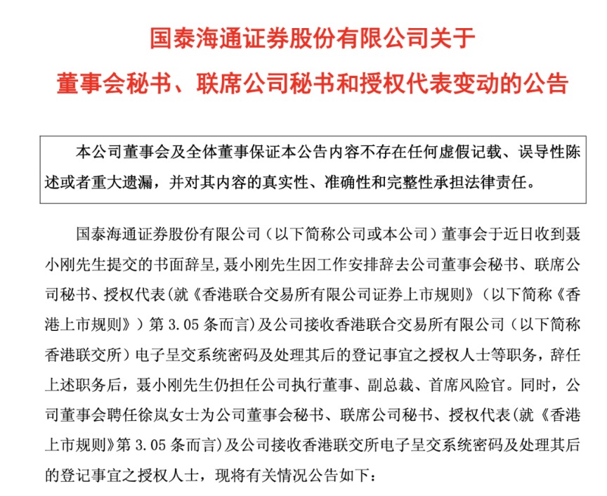 同日,国泰海通还官宣了新任董秘人选。公司现任董事会秘书聂小刚因工作安排辞去董秘等职务,继续担任公司执行董事、副总裁、首席风险官;同时,公司董事会聘任徐岚为公司新一任董事会秘书。