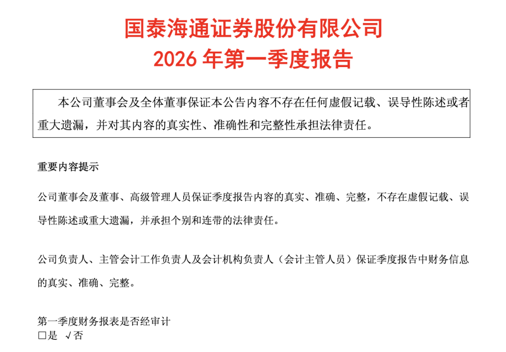 此外,国泰海通在一季度正式发布新一期三年战略规划纲要(2026—2028年),并全面焕新“国泰海通共识”企业文化理念体系。公司“新战略”通过擘画“一个目标、两大担当、三项策略、四维驱动、五根支柱”的战略宏图,共塑“总规划+专题规划+业务管理分规划+分公司分规划”的战略规划体系,搭建了战略顶层设计,并细化构建了全面领先优势的具体举措;“新文化”凝聚众智、全员共创,构建了以“与国同进、领航深蓝”为文化定位的“国泰海通共识”新文化理念体系,在传承中创新、在融合中焕新,推动文化领航战略升级、赋能组织变革、促进整合融合、塑造品牌价值。